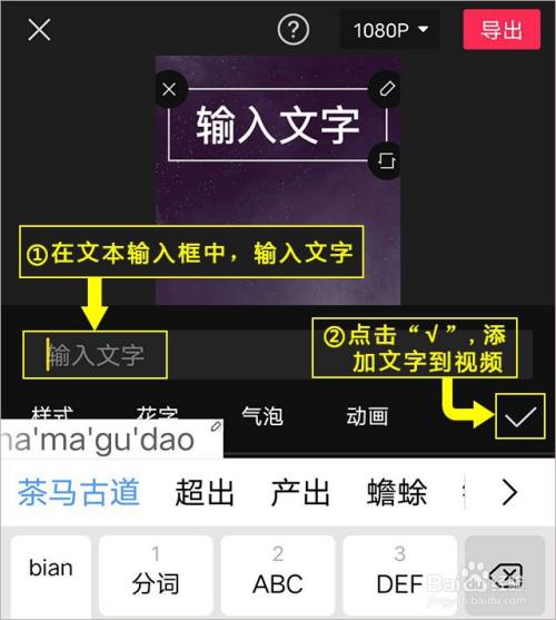 输入文字。在文本输入框中,输入文字,点击“√”,添加文字到视频。