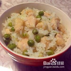 大米提前半个小时淘洗干净,并加好和平时一样煮饭的水量。提前3-5分钟打开电源加热。然后把炒好的鸡肉豌豆倒进电饭煲中,用铲子铲均匀,一起煮到自动跳开按钮!