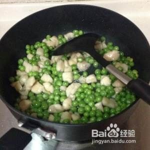 坐平底锅烧热,下一勺猪油,把鸡胸肉划散开,再下入豌豆炒一分钟,加盐和鸡粉调味!