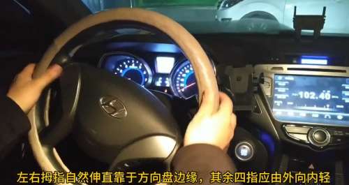 2左右拇指自然伸直靠于方向盘边缘,其余四指由外向内轻握方向盘。