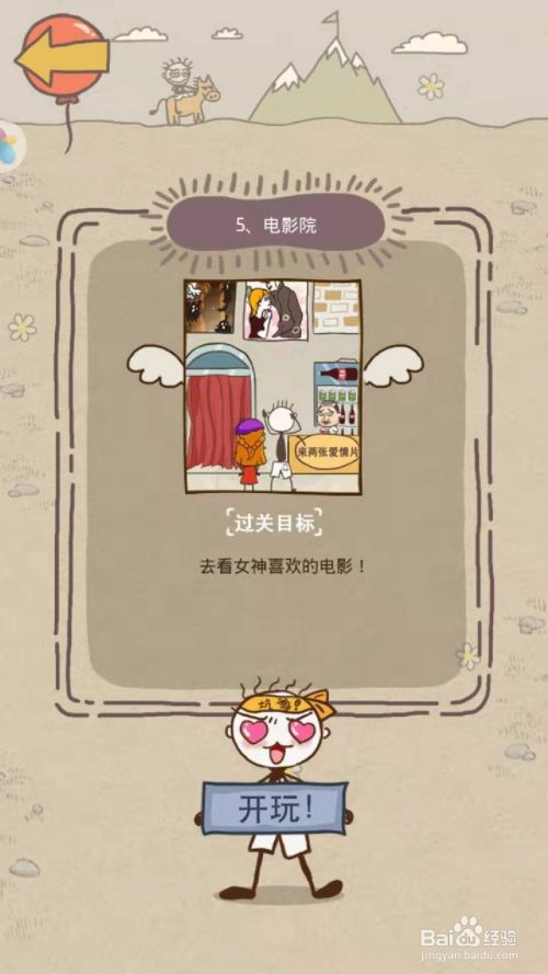 第五关,先看一下过关目标(去看女神喜欢的电影),这对你了解线索有帮助,点击开玩,如图所示