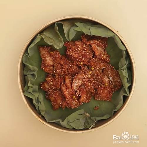 把肉铺满荷叶。再盖上荷叶,中火蒸40分钟。撒上葱花即可。