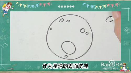 首先用细黑色马克笔在画面中心画一个圆,在圆内大大小小画几个小圆圈作为星球的表面坑洼。
