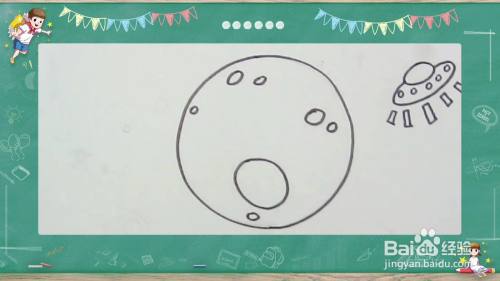 然后在星球右侧用椭圆形画出一个飞碟,加上小长方形作为飞碟的光束。