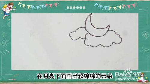 首先在画面最上方用细黑色马克笔半圆形画出一个弯弯的月亮,在月亮下面画出软绵绵的云朵。