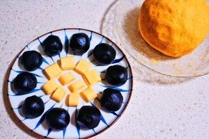 豆沙分成等份大小(凭自己做的分量来估算,差不多就行。)芝士我取了两片,切好,对折成较厚的芝士芯。备用。
