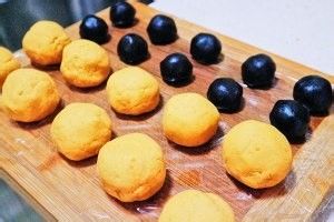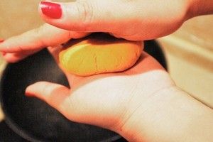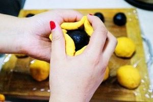 按压红薯团,像包饺子一样,把做好的豆沙芝芯放进去。