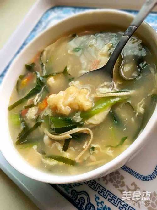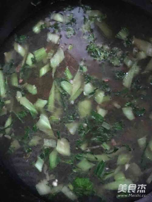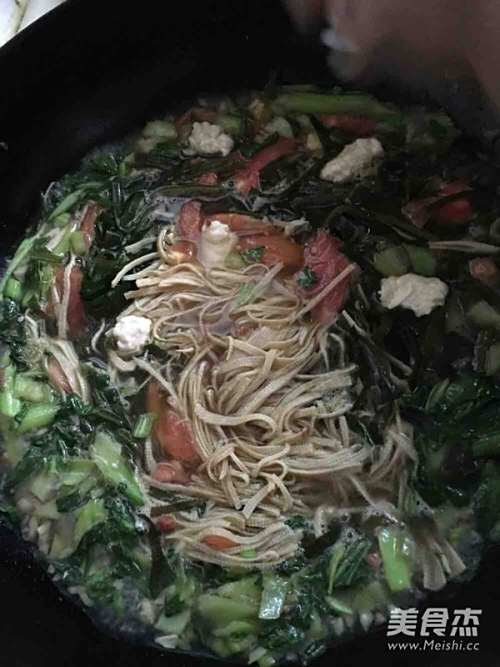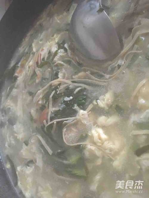 8将洗面筋的水分次倒入,要看锅里汤的浓稀度分次倒入,最后煮开再煮一会,这时要不停搅拌防止粘底