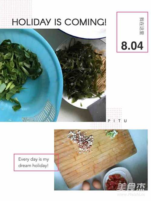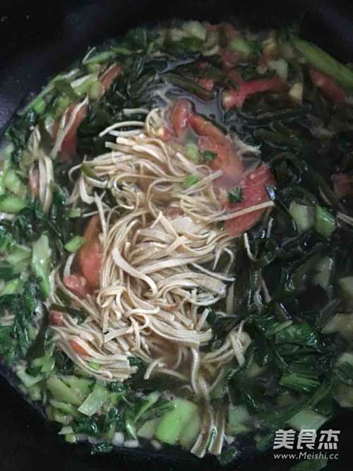 2利用醒面的时间切菜,花生米切成小块,葱切葱花,油菜洗净切段,豆腐皮和海带丝切段,西红柿去皮切小块(菜多没有照进去)