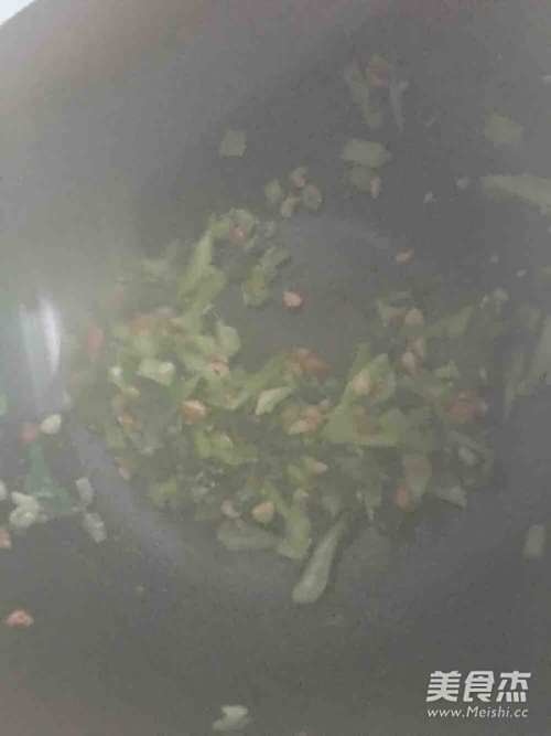 4锅中倒入油烧温热时放入花生碎炒香,再加入油菜翻炒片刻