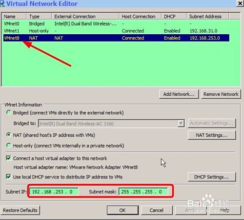 例如选用最方便的NAT连接方式。并注意下面的IP地址,以下的GUEST OS(虚拟机中的OS我们成为GUEST OS)静态IP地址配置中会用到。如其中网段为192.168.253.0/24