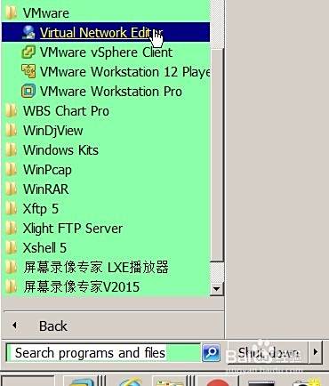 依次进入并打开Program->VMware->Virtual Network Editor。如图,也可直接搜索程序名,virtual network editor.