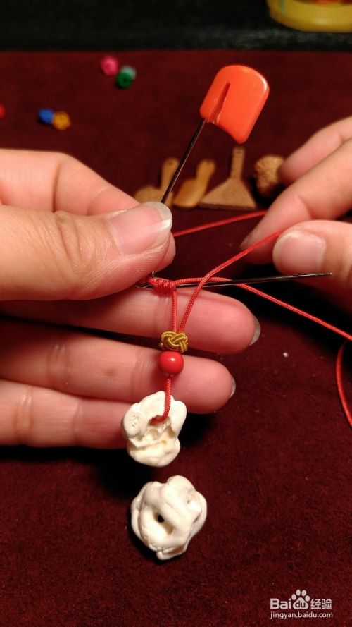 取其中一根线正面穿进菠萝扣、朱砂圆珠、猪精骨里,绕过猪精骨再从朱砂圆珠里反穿出来,如下图所示。