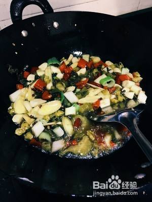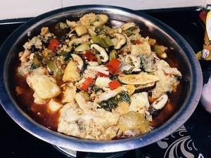 鱼本来就炸熟了。所以不用煮太久了。煮久了鱼块就会烂。鱼和菜熟后捞出来放到一个大盆或大碗。一定要大盆噢。连鱼带汤一起倒入盆里