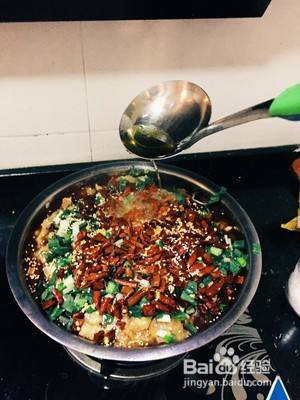 另取一只锅,加入一斤油。(最好是菜籽油特香)大火烧热八九成热。一定要高油温,才能把辣椒的香味提炼出来。(注意安全噢)用勺子一勺一勺地淋在刚才的佐料上。完成