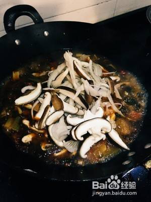 汤底熬煮好后,放入配菜平菇、香菇和鱼块,盖上锅盖大火煮