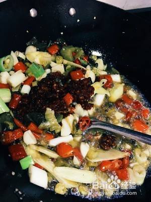 调料炒出香味以后,放入豆瓣酱再次炒香(炒出红油,就是油跟豆瓣酱融合变红)