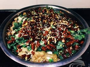 第二阶段(麻辣香味的关键步骤)在盆的表面撒满干辣椒段、葱花末、芹菜末、芝麻
