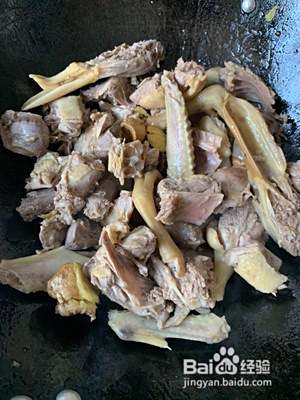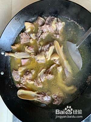 倒入鸭肉煸炒片刻,倒入黄酒炒至出香味即可(炖汤不用炒很久,炒至有香味既可)