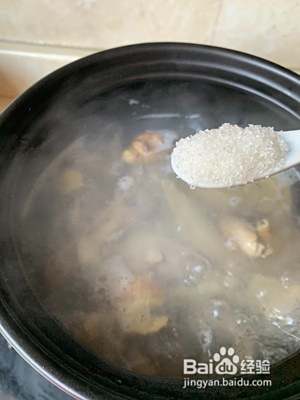 倒入少许白糖加入少许黄酒,大火煮沸转文火慢炖