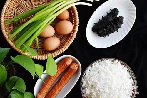将发好的海参、胡萝卜、黄瓜切小丁,葱切碎,鸡蛋打散锅内,热油炒散捞出备用;锅中留底油,放葱花炒香,加胡萝卜、黄瓜丁、盐,翻炒;接着放入熟米饭,翻炒均匀后,加海参丁、鸡蛋炒至入味即可。