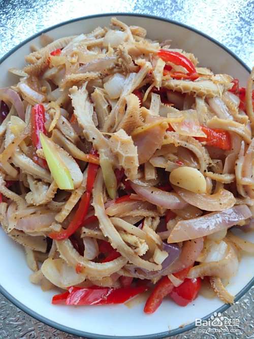锅里倒油小火花椒煸香丢掉,倒入葱姜蒜,倒入洋葱红椒翻炒几分钟后加入羊肚丝继续翻炒3四分钟,加入调料,起锅加点黑胡椒粉,味道绝佳