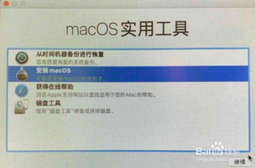格式完成后关闭磁盘工具,回到“macOS实用工具”选择“安装 macOS”,点继续;