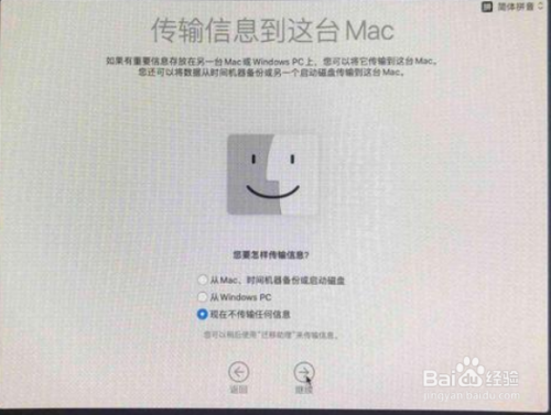 传输信息到这台Mac,选择“现在不传输任何信息”任何点继续;