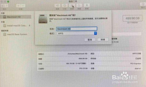 在左侧边栏选择整个内置硬盘(不要选择分区),然后点顶部工具栏的“抹掉”,名称输入Mac默认的名称“Macintosh HD”,格式选择“APFS”,点击“抹掉”(请先提前备份需要的数据);