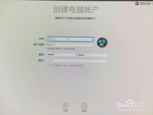 创建电脑账户,输入你的全名、账户名称和密码点继续;