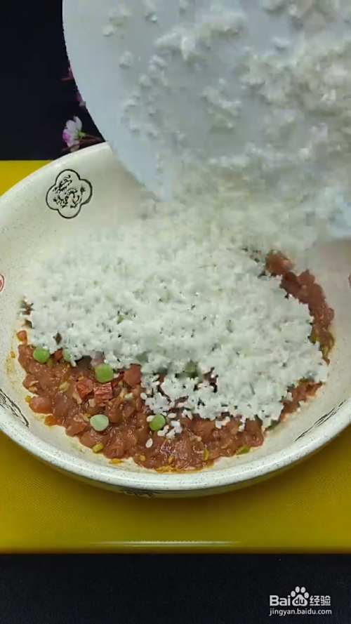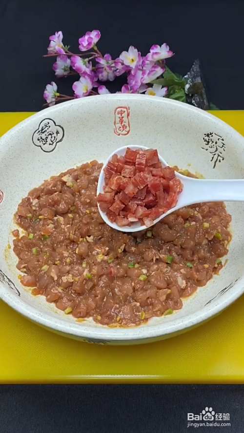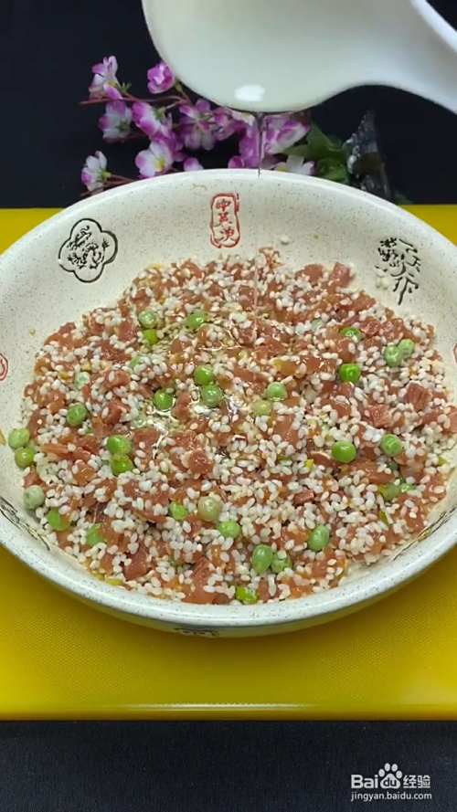 腊肠切丁放入到肉馅里 再放青豆 糯米搅拌均匀;