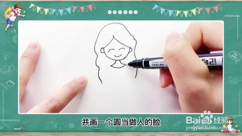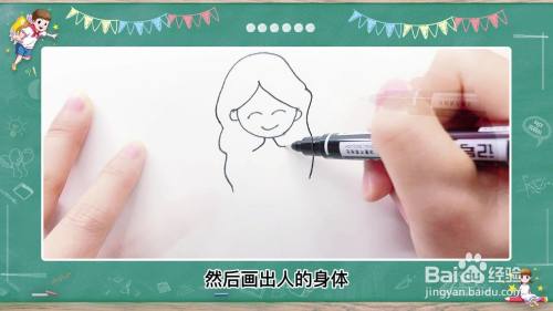 首先用笔在白纸上画出人长长的头发,然后画出人的身体并画一个圆当做人的脸