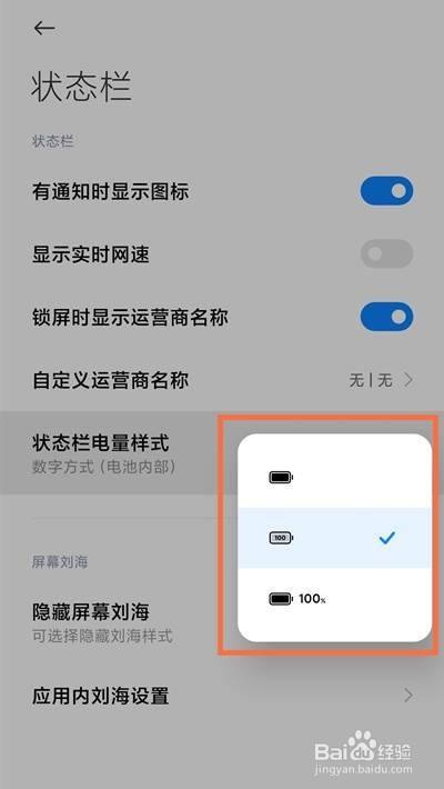 点击【状态栏电量样式】,即可设置电量显示方式。