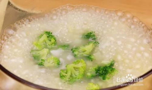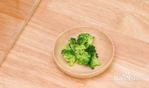 放入西兰花,焯水 2 分钟,颜色变深后捞出。