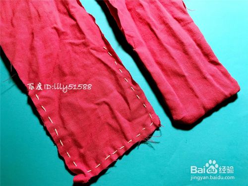 将长方形的布翻过来在里面的下边用线缝上一半,然后再翻到正面上,如下图;
