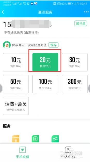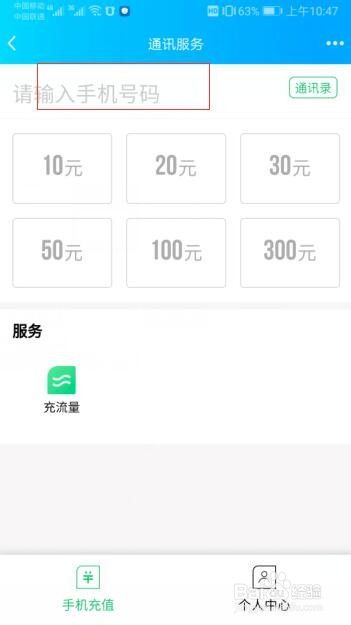 然后在“通讯服务”的操作界面中,在下方的位置中选择要充值的金额。