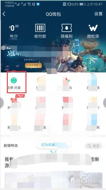 在打开的“QQ钱包”的操作界面中,然后点击“话费流量”选项。