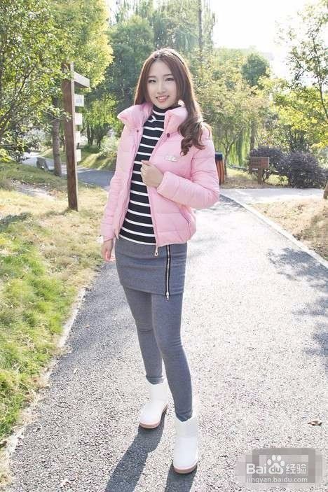 粉色的羽绒服,背后有很帅气的豹头哦~,黑白条纹的打底背心很百搭,加白色雪地靴就OK啦