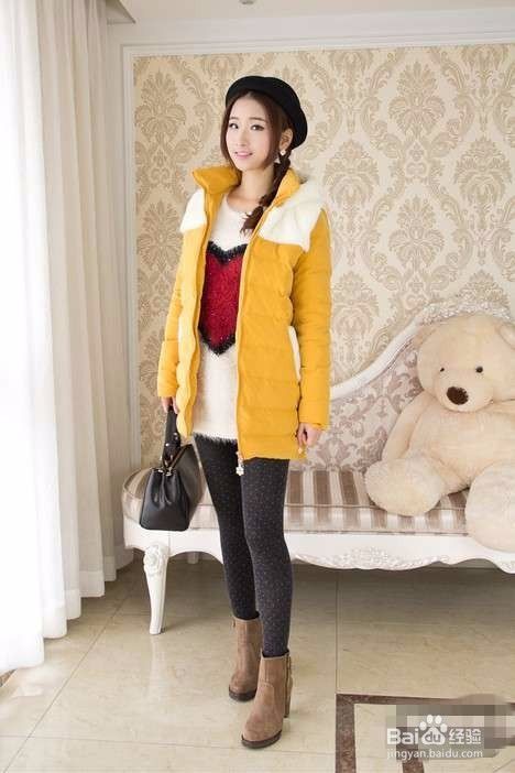 很喜欢这件姜黄色的羽绒服,毛绒拼接的,质量很赞,内搭爱心马海毛的长款毛衣,鞋子也选择黄色系。