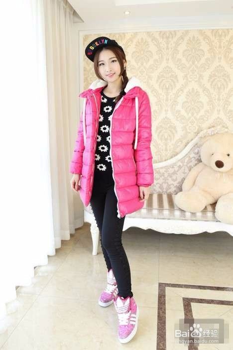 这么冷的冬天一定要穿一件看起来就暖和的衣衣哦,粉色的衣服 和粉色的鞋子,内搭小花黑色针织衫,红黑配~