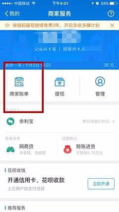 在顾客扫码收到钱之后,我们可以在商家服务中通过商家账单查询到收入情况。