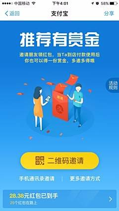 建议广大商家小伙伴们开通支付宝的“推荐有赏金”活动,可以在客人领取红包再扫码付款后,获得最低0.1元的奖励金额。