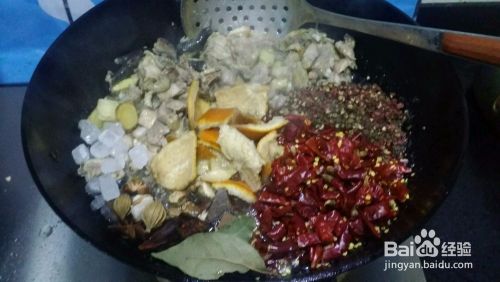 鲜汤放入不锈钢桶中,加入跑油后的香料以及花椒、干辣椒节,烧开后调入糖色、精盐和味精,小火熬7~8小时,煮出香味即成。
