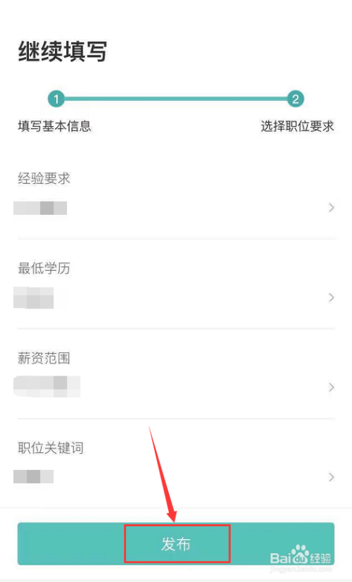 在继续填写界面,选择职位要求后,点击【发布】即可。