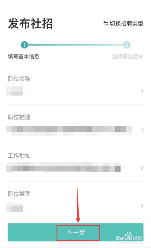 在发布社招界面,填写基本信息后,点击【下一步】。