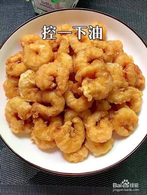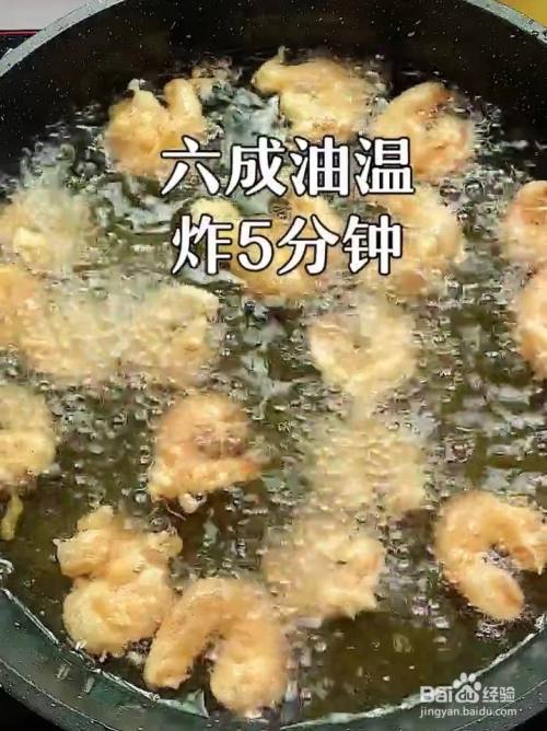 虾仁粘上液体,下六成热的油锅炸5分钟