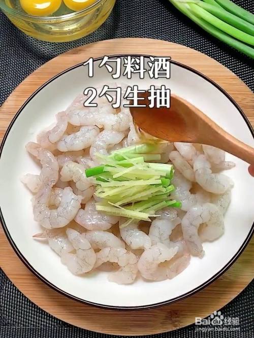 剥去壳的虾仁放入碗中,加入葱姜段,1勺料酒,2勺生抽,1小勺盐,1勺胡椒粉,腌制10分钟