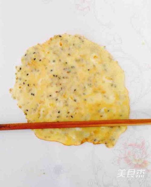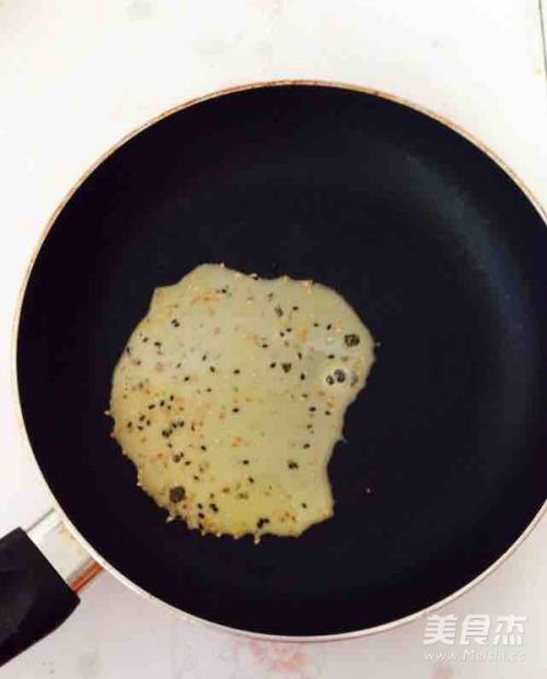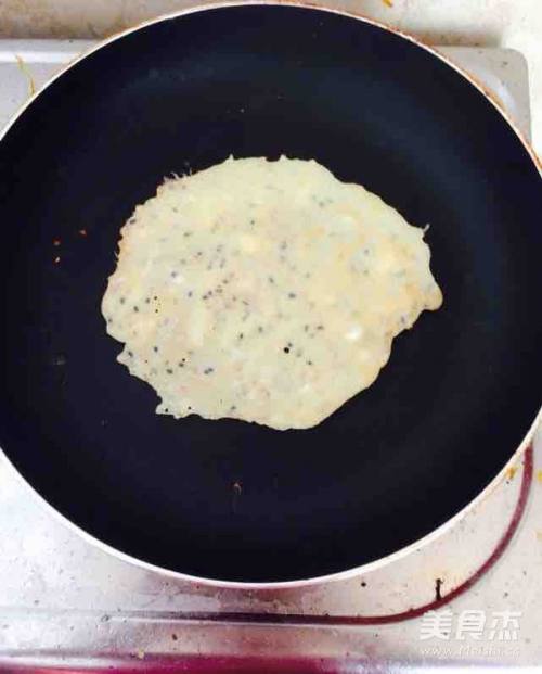 7把蛋液糊倒入平底锅中,转动锅底推动面糊摊均匀。