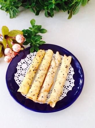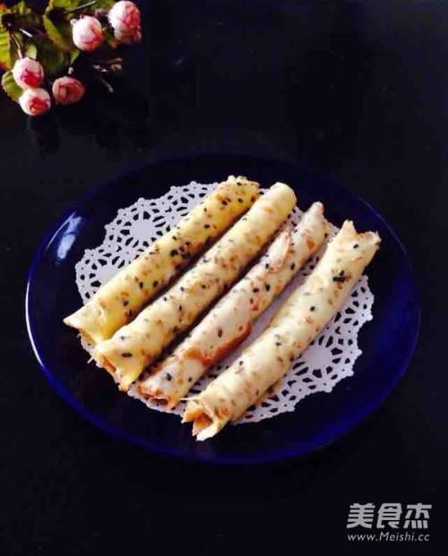 9煎好的蛋卷取出,用一根筷子放在蛋皮的一处,这个时候平底锅要取下来,不能放在炉子上,因为锅子受热,不好摊饼。
