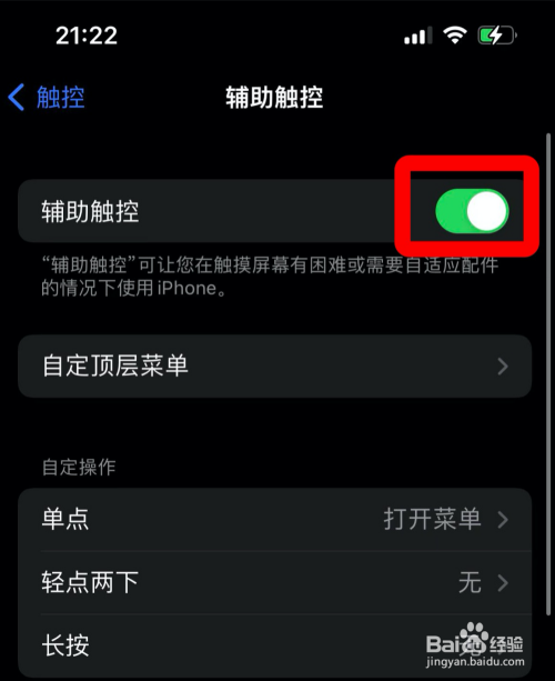 在苹果13辅助功能设置中,点亮“辅助触控”功能。